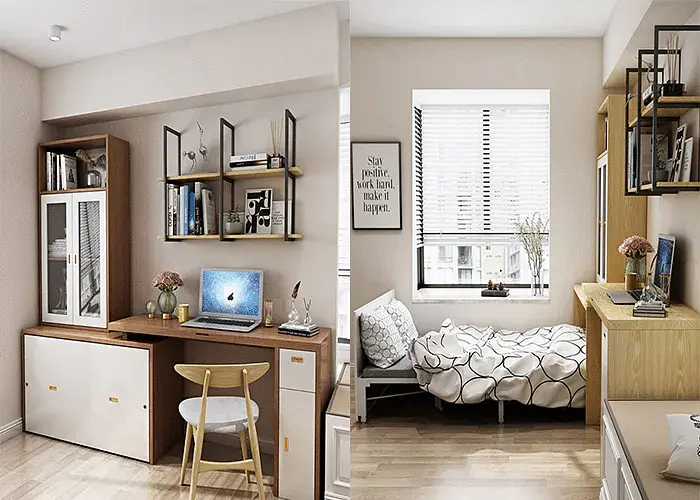 한 가지 팁은 거실에 플로팅 책상을 두는 것 입니다. 이것은 업무 관련 서적과 기타 필수품을 보관하는 공간으로 사용될 수 있습니다.